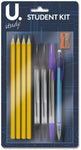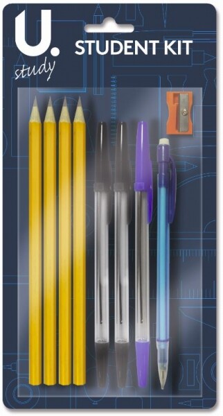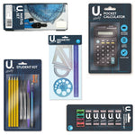 This Set Includes: Student Kit Contains: 4 pencils, 2 black ballpoint pens, 1 blue ballpoint pen, 1 mechanical pencil, 1 sharpener Maths Set Contains: 1x Protractor,1x Ruler, 2x Set squares, 1x 15cm Ruler, 1x Eraser, 1x Compass Geometry Set Contains: 1x 30cm Ruler, 1x 14cm Set Square, 1x 10cm Set Square, 1x 10cm Protractor Eraser and Sharpener Set Contains: 5 Erasers, 4 Assorted Coloured Sharpeners Pocket Calculator |